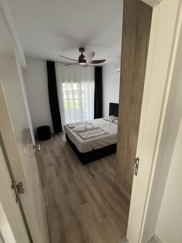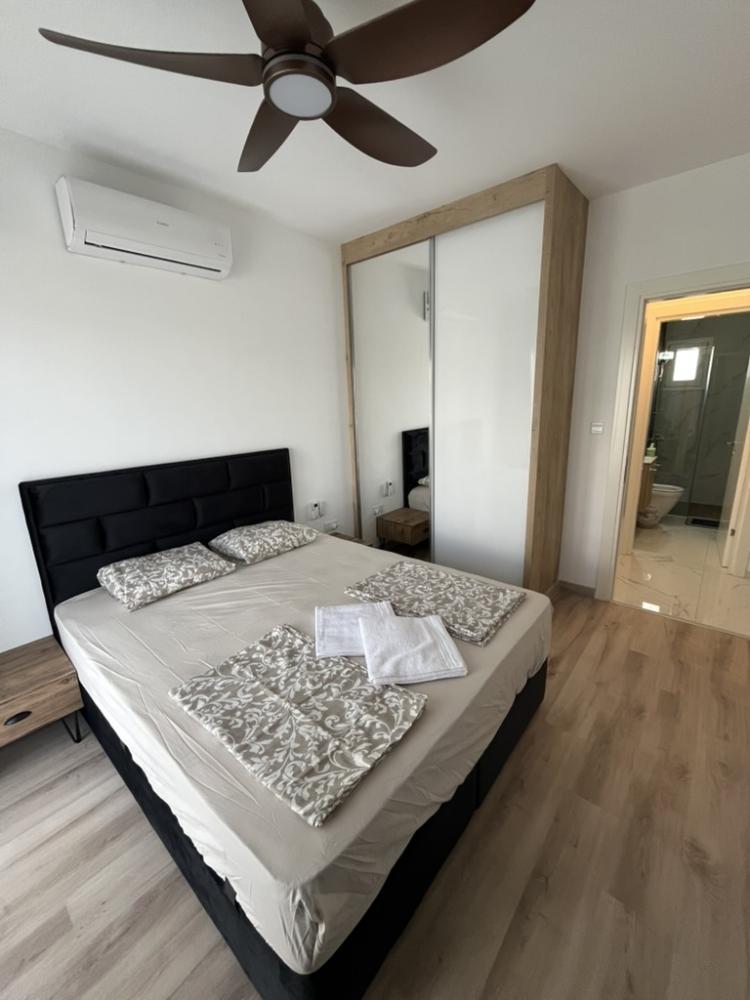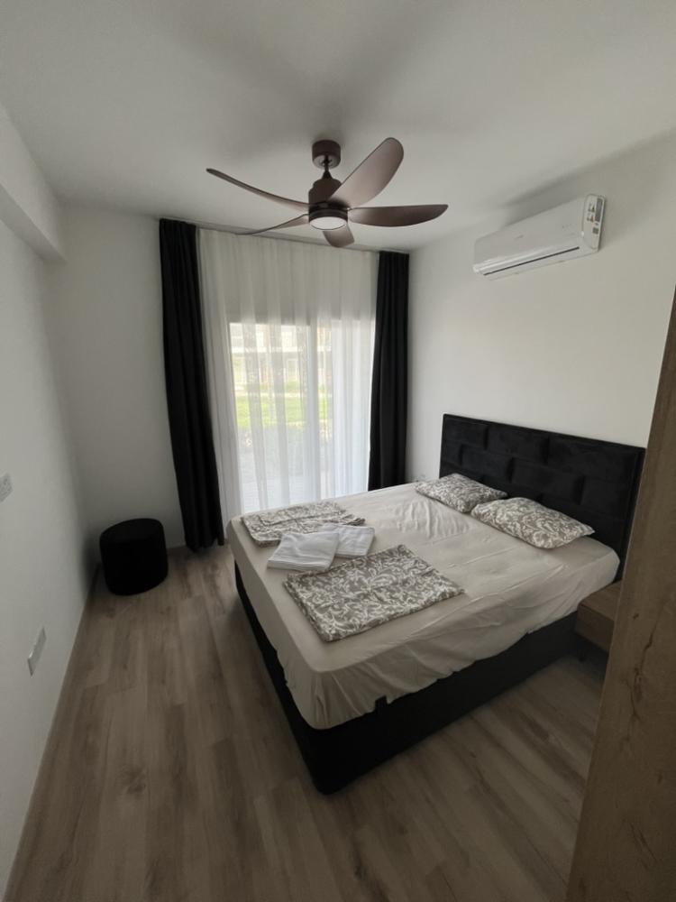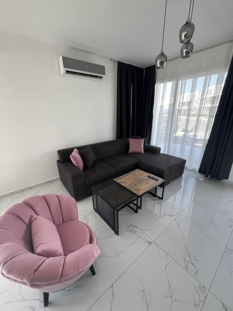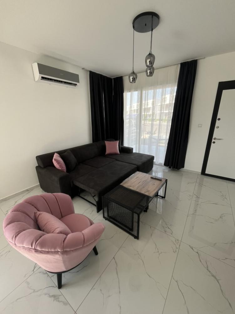 We offer a garden apartment for 2 + 2 persons with 2 terraces - one facing east and the other facing west with a view of the mountains and the resort. The apartment is located just 600 meters from the sea in Cyprus, in the Iskele area. The garden apartment has a separate bedroom, a bathroom with a shower, and a large living room with a sofa bed and a kitchen. The apartment is fully equipped: TV, bed and spacious sofa, 1 bathroom, refrigerator, washing machine, oven, cooktop, air conditioning, bed linen, and towels. The resort is new, and from the terrace, you can see the children's playground, with pools featuring slides located about 100 meters away. There is plenty of greenery and a peaceful environment all around.